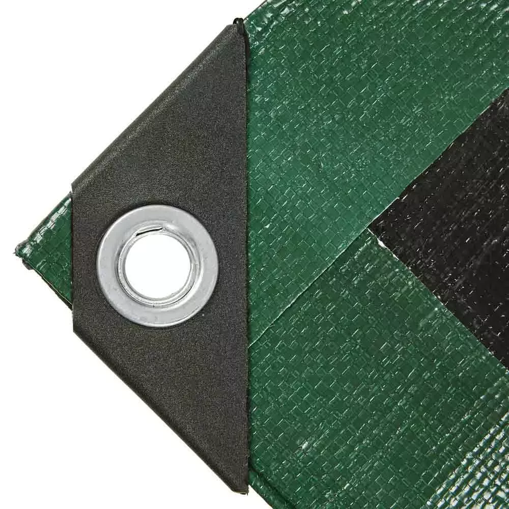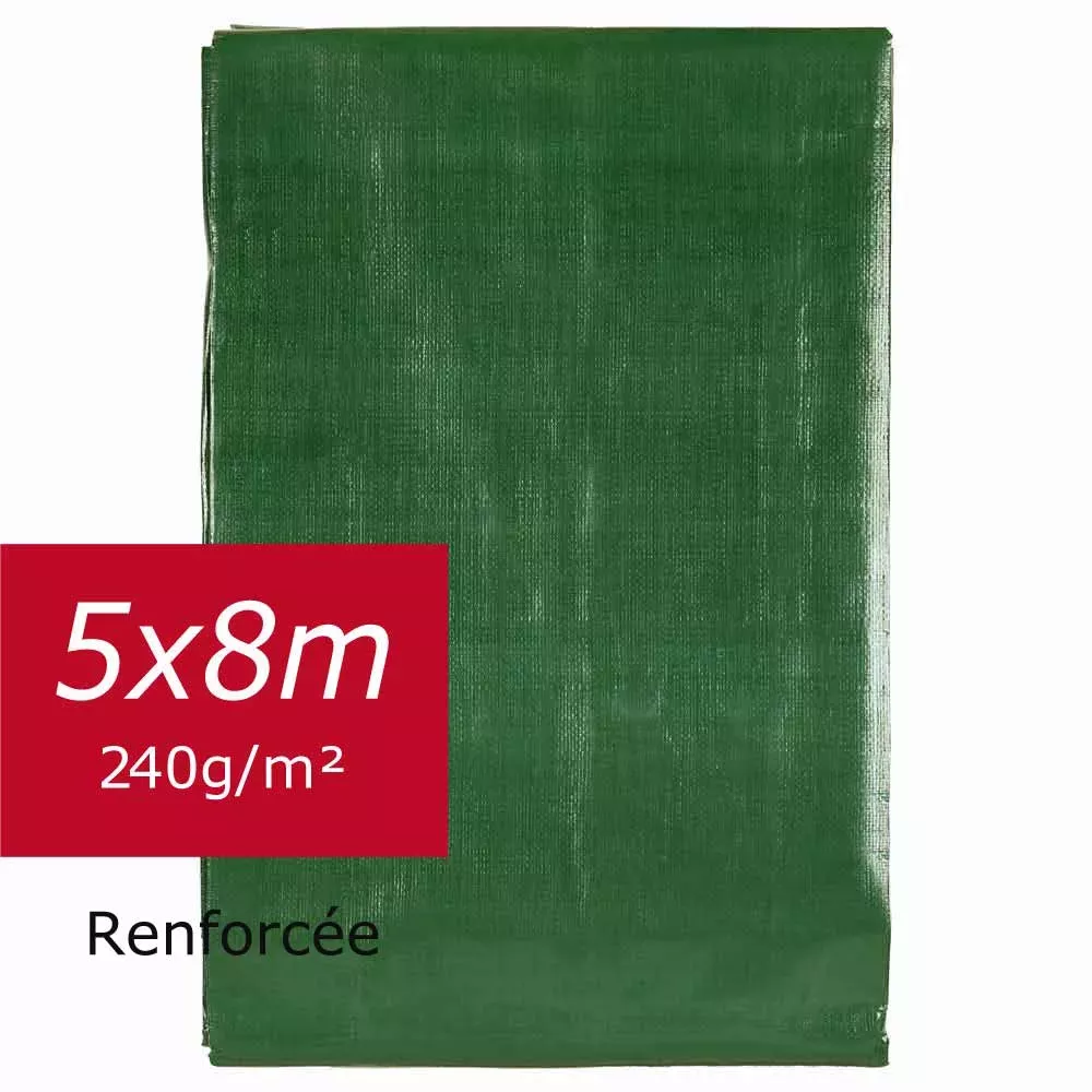 Cette bâche épaisse 240g/m² couleur verte, grande taille 5 mètres sur 8 mètres (40m²), en polypropylène tissé, est traitée anti UV et pluie.
