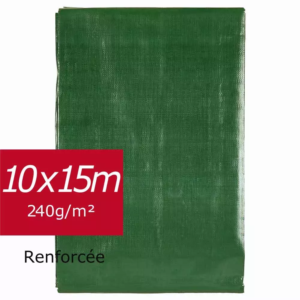 Vendue à l'unité, 1 bâches 10x15 m (150m²), avec œillets aluminium disposés tous les 50cm, en polypropylène tissé 240g/m ² vert, anti UV, coutures à chaud renforcées intègrent un lacet de serrage, résiste au gel (– 30°C), et à la chaleur (+ 70°C).
