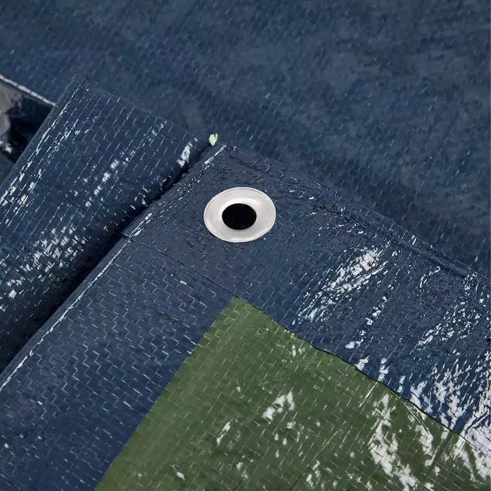 Bâche d'extérieur en taille 6 mètres sur 4 mètres avec des oeillets disposés sur tout le tour, pour la protection fiable de vos travaux de construction et réfection de toiture.