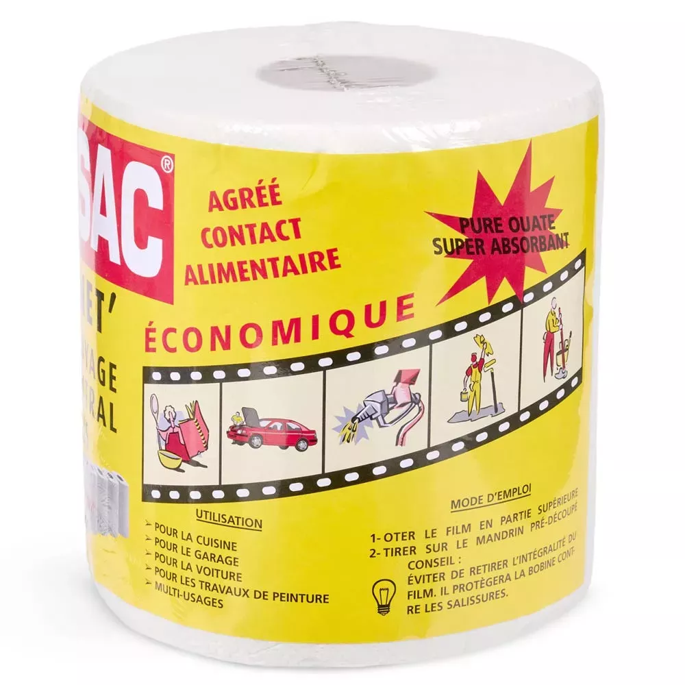 Feuilles d'essuyage jetable pour huile de moteur et traces de peinture, prédécoupées pour une utilisation rapide et efficace. Pure ouate de cellulose blanche gaufrée 2 pli. Dévidage central et latéral