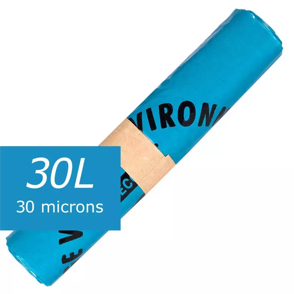 Vendu uniquement en grosse quantité à prix professionnel : 25 rouleaux de 20 sacs 30 L, en polyéthylène bleu (plastique basse densité), certification environnementale sur demande, norme CE, dimensions : 50 × 70 cm, épaisseur : 30 microns.