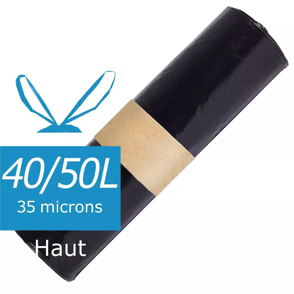 Vendu uniquement en grosse quantité à prix professionnel : 25 rouleaux de 10 sacs 40/50 litres avec fermeture à poignées coulissantes, PEHD Noir, dimensions : 60 x 85 cm, épaisseur : 35 microns.